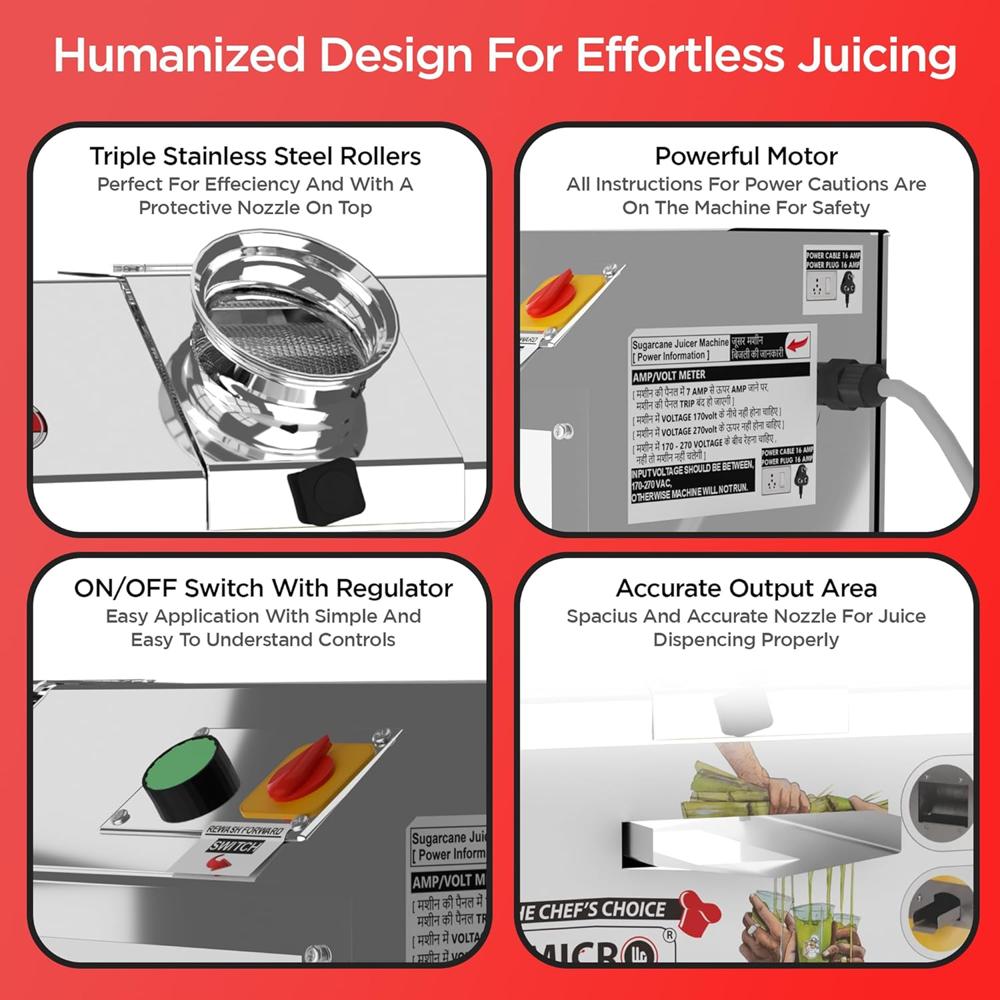 A: This automatic machine runs on a 1.5HP MG-2 motor, powered by 230VAC, 50Hz voltage. Simply feed cleaned sugarcane pieces into the hopper, and the machine extracts juice efficiently with minimal effort.